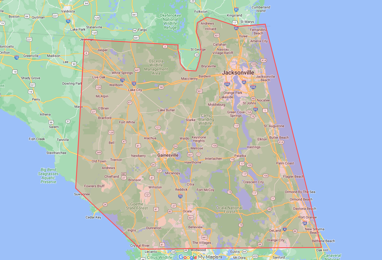 We cover ALL of Jacksonville plus as far North as the Georgia border, as far West as Lake City and as far South as The Villages